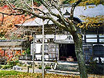 芭蕉の弟子・向井去来が晩年を過ごした茅葺き屋根の庵。去来が商人に売る約束をした庭に実った柿がその夜に嵐ですべて落ちてしまったことから、去来が名付けた。茅葺き屋根の素朴な家で、松尾芭蕉も何度か訪れ嵯峨日記を記した。去来が在庵の時は玄関横に蓑笠を吊したように、今でも蓑笠が見られる。庭に去来の基がある。 |