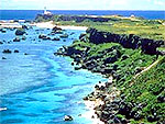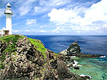 石垣島西端、屋良部半島の岬。紺碧の美しい海を見下ろし、断崖や奇岩が続く景勝地。南国らしい風景の中に、真っ白い灯台が立っている。テッポウユリ群生地としても知られており、5〜6月には岬周辺で美しい花が咲く。遠く海上には西表島をはじめ、鳩間島や小浜島などが見える。西向きの岬だけに、夕景も見逃せない。珊瑚礁もあり、一帯はダイビングスポットとして人気。 |