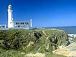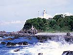 高さ30〜40mの海食台地が続く突端に、イギリス人技師ブラントンの指導によって1874(明治7)年に生まれ変わった燈台が立つ。もとは、沖合を行き交う船の安全を守るために1635(寛永12)年に設置されていた。付近一帯は御前崎ケープパークとして整備され、遊歩道の途中には展望台もある。燈台から白羽(シロワ)にかけては風食礫の海岸段丘が続く。また、付近の海岸は貴重なウミガメ産卵地で国の天然記念物。 |