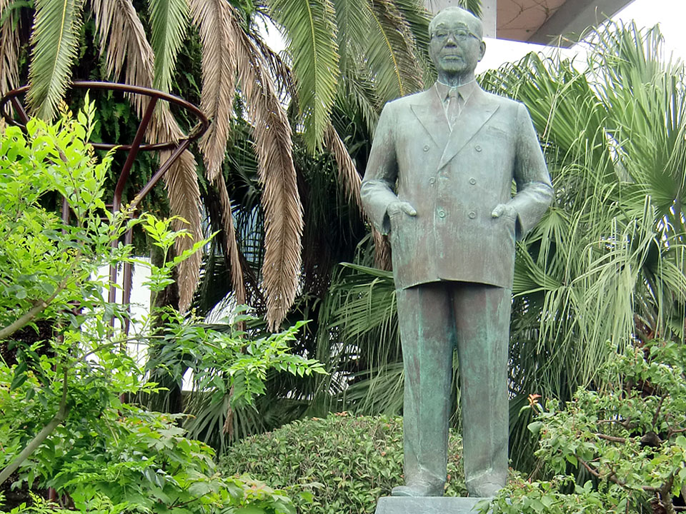 岩切章太郎は宮崎交通初代社長で、地方創生の先駆者。「観光宮崎の父」と称される。堀切峠をはじめ宮崎各地にフェニックスを植林し南国情緒あふれる景観をつくり、こどもの国やえびの高原などの開発も推進した。「自然の美 人工の美 人情の美」の名言も知られ、宮崎市役所東側の国道220号線橘橋北詰近くに銅像がある。国道を挟んで橘橋の東側、大淀川沿いに約800m続く「橘公園」も岩切章太郎が整備した。