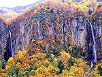 左側に落差85mの権現滝(男滝)、右側に落差75mの不動滝(女滝)。2つの滝の間には米子不動尊奥の院が祀られている。駐車場を起点に1周約3km、所要90分程の散策道で滝巡り、標高1480mにある東屋からは2つの滝を展望できる。滝周辺は信州屈指の紅葉スポットで、見頃は10月中下旬。冬は滝が氷結するが、降雪で通行止に。日本の滝百選。 |