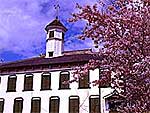1875(明治8)年にアメリカ帰りの地元棟梁・市川代治郎によって建築された。八角の望楼が印象的な白塗りの木造2階建。八角の望楼には時を告げる太鼓が置かれており、太鼓楼とも呼ばれる。2階の廊下の丸窓・欄間にはまっているステンドグラスは、文明開化の象徴として評判になった。隣には教育資料館がある。国の重要文化財。 |