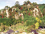 数ある裏耶馬渓の奇勝の中でも代表的な景観。岩峰や岩壁がそそり立ち、麓には民家が点在する。荒々しさと長閑さが一緒になった独特な山里風景が約1kmにわたって続く。様々な色が奇岩を彩る紅葉風景や雪景色も独特の美しさ。県道43号が通っており、展望所や農産物直売所などもある。また、近隣の奇勝を巡るウォーキングやドライブもおすすめ。