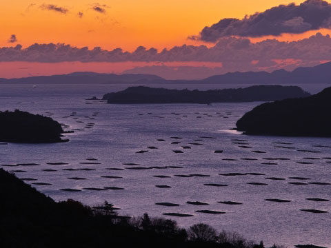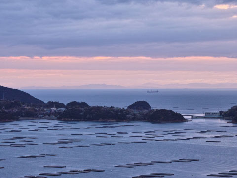 多くの牡蠣筏が浮かび島々が点在、風光明媚な湾。平清盛の父・平忠盛もここで「虫明の 迫門の曙見る折ぞ 都のことも忘られにけり」と和歌を詠んだという。県道465号線沿いの「迫門の曙」が展望ポイント。日本の朝日100選に選定されており、筏や島々など湾全体が赤く染まり、刻々と変わる絶景を楽しめる。9月1日前後の1週間は、島々の間から朝日が昇る。