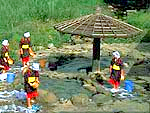 奥津温泉の伝統風物詩。川原で立ったまま洗濯をするのは、かつてはよく出た熊や猪に襲われないよう、周囲に気を配りながら洗濯をするようになったため。地元では今でもこのスタイルで洗濯する人も。温泉に含まれる漂白成分によって洗濯物がきれいになるという。3月上旬頃から12月中旬頃の日祝、朝8時半から奥津橋付近の川原で観光用に実演してくれる。絣の着物と赤いたすきで奥津温泉小唄を歌いながらの足踏み洗濯だ。 |
