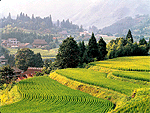 標高400mの山間で、すり鉢状の谷の3面に棚田が広がっている。真ん中に立てばぐるっと棚田を見上げることができる。42.2ha、約850枚の規模で、全体の高低差は160m。田んぼ1枚あたりは棚田の割には広く、機械も入りやすい。法面は土で盛ってあるのも特徴。栽培された米は棚田天然米「今擦米」として高く評価されている。夕景の棚田は特に見事。日本の棚田百選。 |