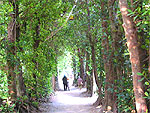 本部半島の先端、海岸に近いこの集落に続く並木。約250戸の集落全体にわたる規模がありフク木は数千本にも及ぶ。台風などに備えた防風・防潮林で、普段は木陰の涼しさを提供している。木の樹皮は染料として利用もできる。集落の家々はフク木の緑につつまれている。木漏れ日を浴びて散策すると気持ちいい。また、観光用の水牛車を楽しむこともできる。珊瑚礁のリーフに囲まれた備瀬崎が近い。 |