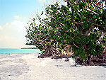 竹富島西側に続く真っ白な砂浜、青い海。干潮時は結構遠くまで砂の上を散策できる程、遠浅の浜。波は穏やかで海水浴などに好適。背景は亜熱帯樹林。売店や更衣室などの施設も整っている。星砂で知られる皆治海岸へと続いている。沖には小浜島や西表島が浮かび、夕日もきれい。 |