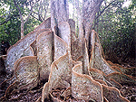 西表島の仲間川を約5km遡ると観光船の終点、ここからわずかに山中に入った所にある。樹高約20m、樹齢約400年で国内最大といわれる。大きく板状に張り出したものは「板根」と呼ばれる木の根っこで、この木の板根は高いところでは人の背丈の倍以上の3.9mもある。昔は、板根の部分がが舟の材料に使われていた。 |