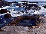 真っ青な海が目の前で眺望と開放感抜群。岩と岩の間に露天の温泉が湧いているだけで、特に施設はない。入浴できるのは干潮の前後2時間程のみ。波が押し寄せてきそうで結構スリリング。混浴で脱衣所などの設備はなく、水着や下着での入浴は不可。単純硫黄泉で飲泉も可。 |