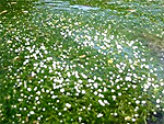 居醒の清水が源流の美しい小川に咲く水中花。バイガモ(梅花藻)は小さな白い花で、名のように梅の花に似ている。場所は醒ヶ井駅の近くで、水温は年中14度前後とほぼ一定、淡水魚・ハリヨも生息している。最盛期には川のいたるところで咲き、流れにゆらゆらと花が川面に揺れている。見頃は5月中旬から8月中旬。 |