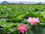 琵琶湖に突き出した烏丸半島の東側で、大きな風車「くさつ夢風車」が目印。群生地は広さは約13haにおよび、花ハスの群生地としては国内最大級。大きな花が見渡す限り一面に咲き、壮観な眺め。周辺は多くの水生植物の宝庫。「水生植物公園みずの森」などが隣接。見頃は7月下旬から8月上旬。 |