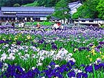 約1haもの広さで豊富な品種が見られる菖蒲園。伝統的な古花を大切にすると共に、新花を独自に作出している。のどかな遠州の山里に、白壁や土蔵、長屋門などをめぐらせた桃山時代からの庄屋屋敷・加茂家の門前に広がる。約4分の1は鉢植えのため、鉢を入れ替えて長く満開の状態を作り出している。見頃は、5月中旬から6月中旬頃。 |