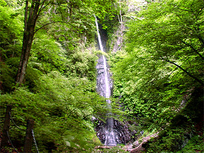 多摩川の支流・小菅川の源流部にかかる。豊かな自然につつまれた山中に滝の音が轟いている。林道沿いの駐車場から徒歩約10分と、手軽な散策コース。途中、山梨の森林100選にも選ばれているシオジ林があり、とてもすがすがしい。ヤマメやイワナの生息地でもある。滝は形が男性のシンボルに似ているところから名付けられ、古来より男性の精力増進や子宝にご利益がある場所と伝わっている。