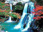 国道193号線沿いで出合から車で約1分。大釜の滝の約4.5km下流にあたる。白い石灰岩から落ちる3段の滝で、下段は4条に分かれる優美な姿。落差は25mで広い滝壺も美しい。国道の脇にあり車からも見える。 |