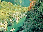 大歩危には、大歩危遊歩道があり、その途中に渓谷を望める展望台がある。結晶片岩が水蝕されてできた溪谷は、大理石の彫刻がそそりたっているかのよう。岩ツツジや紅葉のシーズンは特に美しい。舟下りや、ラフティングもできる。小歩危は、大歩危に比べると規模が小さく優しい眺めだが、岩肌の美しさは大歩危に劣らない。河原と奇岩をぬって遊歩道があり、風景は変化に富んでいる。 |