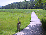 標高約550m、南北約2kmの細長い盆地に広がる約40haの湿原。サギソウやオオミズゴケ、イシモチゾウなどの水生植物が繁茂、食虫植物などの珍しい湿原植物も多い。サギソウは8月初旬頃開花。盆地南端は「たびの尻滝」となって谷に流れている。木道や休憩所、野鳥観察小屋などが整備されている。湿原近くまで通じる林道からは山村風景や山々の見晴らしがいい。 |