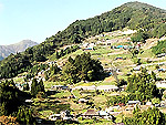 東祖谷の急斜面に広がる集落で高低差は約390mにも及ぶ。三所神社周辺の鎮守の森や民家、畑地が並ぶ山村集落の景観が見事。約350もの石垣が重なり、民家は工法や間取りなど祖谷地方の特徴のもの。その中には江戸時代中期の民家も残っている。中上地区から落合地区を眺望できる。国の重要伝統的建造物群保存地区。 |