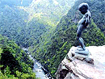深い谷が刻まれた祖谷渓・七曲の断崖上に突き出した岩。谷底までは200m以上もあり、目がくらみそう。祖谷街道の工事では、爆破から崩れ落ちずに残った。現在は、小便小僧の像が立っており、祖谷渓の観光ポイントとなっている。谷の反対側には、ケーブルカーで谷に降りる露天風呂で知られる祖谷温泉が見える。 |