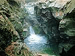 連続する釜状の甌穴に水が流れ込む。山間で狭まった貞光川の河床にできた連続する釜状の甌穴。水流が音を立てて川床の岩盤がえぐられたような釜へ流れ込む珍しい峡谷美。滝壷が釜の形に似ているのが名がついた。一ノ釜、二ノ釜、三ノ釜と続き、滝壷から水しぶきが白煙のように湧き立ち、確かに釜のように見える。県の天然記念物。 |