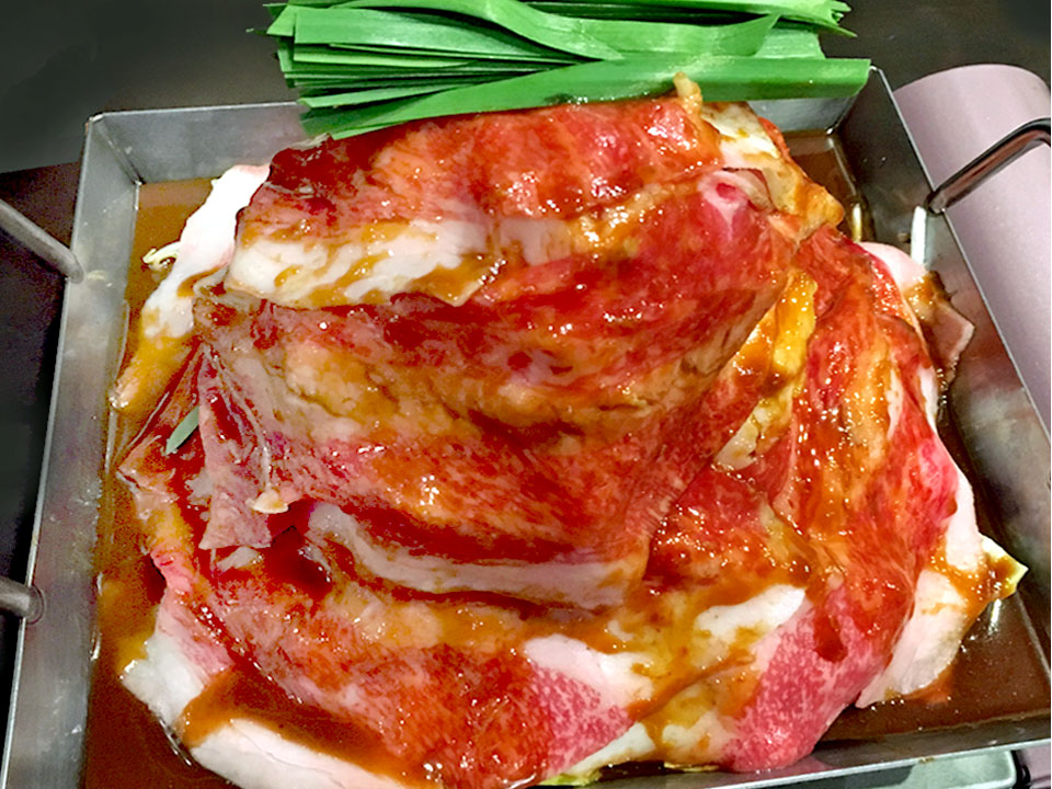 野菜の中にホルモン、和牛バラ肉をのせ、特製のタレで頂く大盛の鍋。