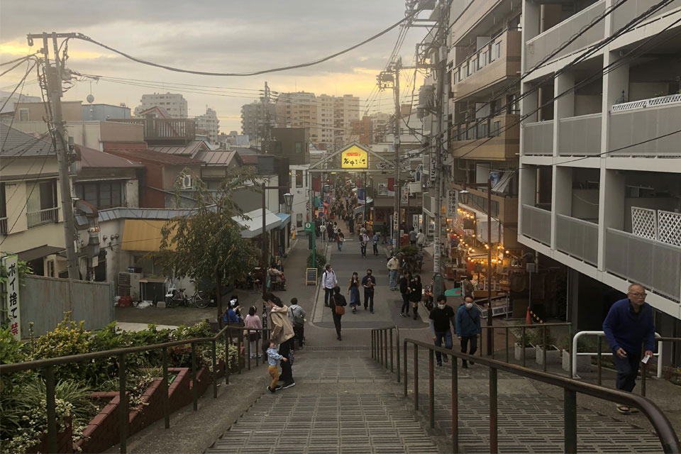 日暮里駅から御殿坂を上り、谷中銀座商店街へと下る坂。一般公募で命名された。長さ15m、高低差4m、36段の階段で両側にスロープもある。この付近では猫をよく見かける。坂の上からは、谷中銀座商店街を見下ろす。商店街やアーチに灯りが点り、その向こうに夕焼け、茜色の空。人の往来も盛んな頃で、風情と人情を感じる情景が広がる。