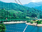 長さが320mある国内屈指の歩行者用吊橋。1999(平成11)年に完成した。箒川の塩原ダム湖上に架かり、自然の風景を楽しみながら空中散策を楽しめる。吊橋の途中で床中央が金網になっており下に湖面が見えてスリルがある。橋は頑丈だが揺れは感じる。紅葉の時期などは混雑する時間も。国道400号側と対岸、両側に駐車場完備。橋を渡ると芝生広場がある。 |