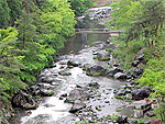 長さ31m、幅5.5m。谷の深さが31mもあり橋脚が立てられないため、両岸から4層にせり出したはね木がテコの原理で橋を支えている。推古天皇の時代、600年頃にできたとされる。桂川渓谷の野猿が藤づるを利用して対岸に往来する姿からヒントを得た構造といわれる。 |