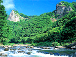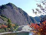 約4千万年の長い月日が形成した礫岩峰。千窟岩、釣鐘岳、桂岳など大小100あまりの円錐形の岩が点在。高いものでは100mに及ぶ。岩肌には岩松や高山植物が自生、周辺にはトチの木の群生も見ることができる。川沿いなどには自然散策路が整備されている。この奇勝の中に、四国霊場の岩屋寺が鎮座。また、国民宿舎・古岩屋荘などの施設も。国の名勝。 |