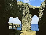 柱状岩の裂け目で海が十字に見える奇勝 |