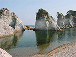 田老港から北方の海上に突き出た3つの巨岩群。高さ50mの男岩を中央に、高さ23mの女岩と高さ17mの太鼓岩が寄り添うよう。男岩の海餌洞をくぐると幸運になるといわれている。駐車場のある断崖上から眺めるが、遊歩道で海岸へ降りて見上げると大きさをより実感できる。岩までは田老港から海岸沿いに徒歩5分。 |