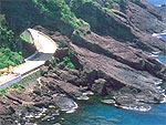 大月半島先端部に続く花崗岩の断崖海岸。太平洋の荒波がつくり上げた大自然の絶景で、紺碧の海と白い花崗岩とのコントラストが美しい。断崖上には遊歩道が続き、各所に設けられた展望台からは豪快な風景を楽しめる。高さ30mの奇岩・観音岩やお万ノ崖も見逃せない。付近はヤブツバキやウバメガシなどの天然林におおわれている。お猿公園や付近の森林内には多くの野生猿が顔を出す。 |