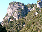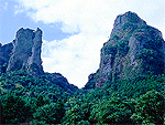 山深い渓谷の両側に岩壁や石柱が林立 |