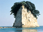 弘法大師が佐渡から能登へ渡った時、最初に目についたことが名の由来と伝わる。高さ28mで、先端部分が突き出て島の形は、前進してくる軍艦に見えるため「軍艦島」とも呼ばれる。島までは岩礁が続いているので、島に近づくことも可能。夜はライトアップされる。晴れた日には遠く立山連峰が望める。 |