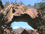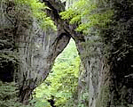 標高670mの乳岩山南面にある巨岩。探勝は遊歩道で1周約1時間。通天橋は頭上に自然に形成された大きな岩の橋が迫る。また、天井に乳房状の鍾乳石が下がる奥行き16mの鍾乳穴があり、洞内に子安観音と三十三ヶ所観音が祭られている。国の名勝・天然記念物。途中の乳岩峡は、凝灰岩が浸食された平らな美しい川床。 |